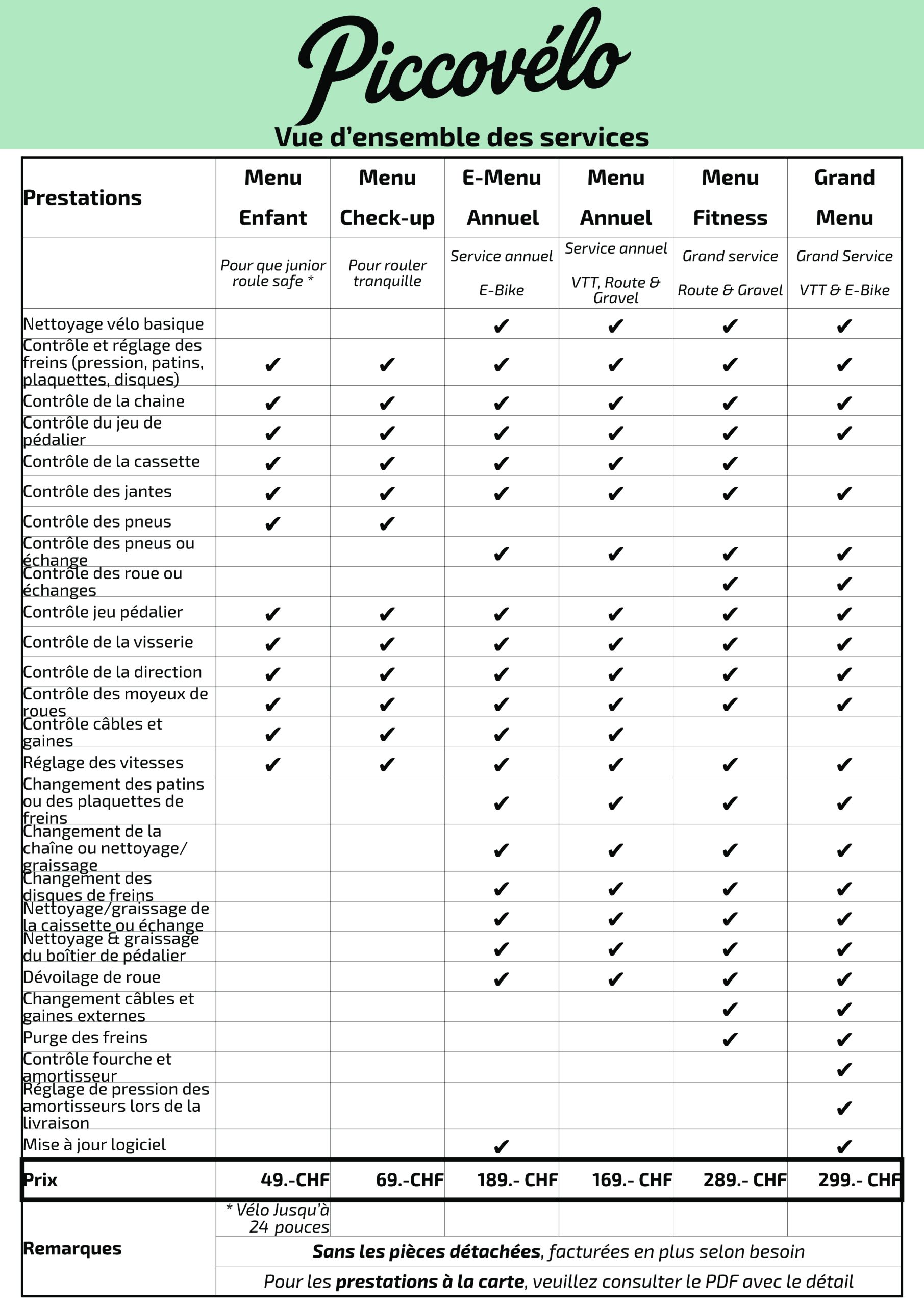 Vous trouverez également une liste des prestations disponibles à la carte.
